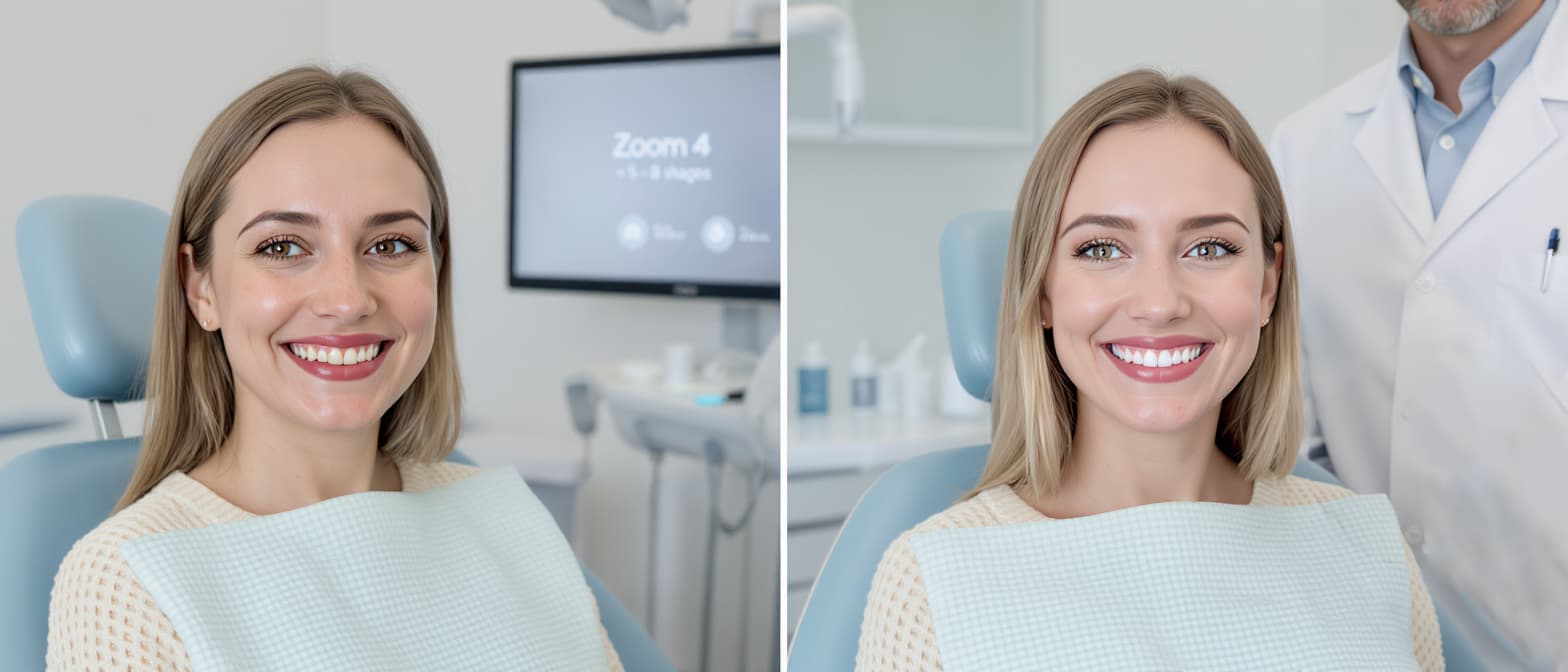 Zoom 4 — это профессиональная система фотоотбеливания, которая заметно осветляет зубы за один визит в клинику. На «до» и «после» результат обычно отличается на 5–8 тонов по шкале VITA, что заметно даже без специального оборудования.